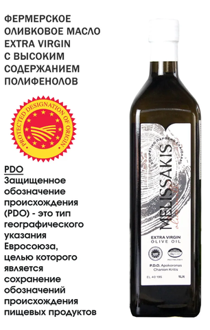 Масло оливковое Extra Virgin Apokoronas Chanion Kritis охраняемого обозначения происхождения PDO. PDO и PGI нельзя подделать, они защищены от мошенничества и являются единственным безопасным способом правильно понять, откуда взялось ваше масло. Каждое такое растительное масло имеет сертификат AgroCert, выданный министерством сельского хозяйства Греции. На банке должен быть желто-красный значок PDO - protected designation of origin, который означает, что продукт был целиком от начала и до конца изготовлен в одном регионе, в данном случае в регионе Apokoronas в провинции Ханья. Апокоронас простирается от предгорий Белых гор на север до побережья, на широкой равнине с пологими холмами. Местность очень зеленая и плодородная, что необычно для скалистого Крита.