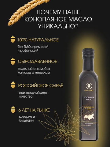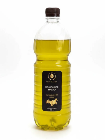 Конопляное масло холодного отжима производится по технологии холодного отжима на современном маслопрессе при низкой температуре до +28 градусов, ни с чем не смешивается, отжимается в день заказа, не шнековое, не соприкасается с металлом и поэтому не окисляется. Это позволяет сохранить все наиполезнейшие вещества, - ненасыщенные жирные кислоты: олеиновая, линолиевая и линоленовая; хлорофилл, витамины и микроэлементы. Конопляное масло пищевое содержит Омега-6 и Омега-3 в оптимальном соотношении 3:1, а также редкие Омега-9. Эти мощные природные антиоксиданты не вырабатываются в организме, поэтому органическое конопляное масло отличный источник получить их извне. На клеточном уровне участвуют в производстве жизненно необходимой энергии. Лечебные свойства сыродавленного конопляного масла просто поражают: оно уменьшает воспаление и борется с раком, решает проблему гормонального дисбаланса, облегчает ПМС, повышает иммунитет, прекрасно увлажняет кожу, способствует здоровой иммунной системе, гамма-линолевая кислота помогает в борьбе с псориазом. Конопляное масло нерафинированное содержит в себе до 50% Омега-6 – линолевой кислоты, она чрезвычайно полезна женщинам - для сжигания жировых отложений, укрепления мышечной ткани, уменьшения объемов в области талии, бедер, живота, естественного снижения веса с одновременным увеличением мышечной массы. Способствует нормализации обмена веществ, снижению уровня холестерина и липидов, укреплению сердечно-сосудистой системы и иммунитета. Высокое содержание хлорофилла, его ещё называют "растительная кровь" из-за сходства с человеческой, благотворно влияет на весь организм в целом, помогая доставлять кислород в клетки нашего организма. Конопляное масло не шнековое имеет мягкий ореховый вкус, не горчит, придает особенный ароматный вкус блюдам, его используют в салатах, соусах или едят просто так. На нем нельзя жарить и готовить, при нагревании полезные вещества разрушаются. Хранить бутылку нужно только в холодильнике, там масло защищено от разрушающего ультрафиолета и находится в комфортной для жизни живых клеток температуре 2-5 °C. Живые сыродавленные масла не способны храниться долго. Живые масла буквально бесценны из-под пресса, а дальше с большей или меньшей скоростью теряют свои полезные свойства, поэтому старайтесь употребить его в течение 3 месяцев. Добавляйте 1-2 столовые ложки масла в свой ежедневный рацион, и вы зарядитесь здоровьем и красотой.