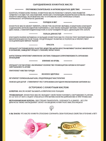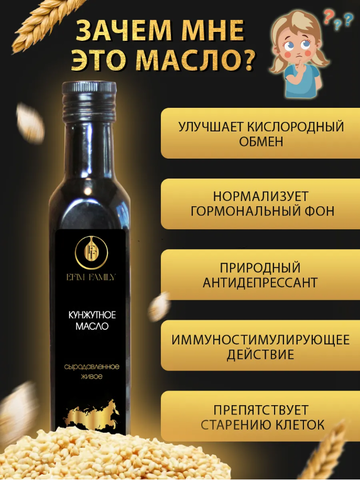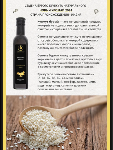 Семена бурого кунжута из Индии. Чистота 99,95% В восточных культурах кунжутное масло считалось не только продуктом питания, но и косметическим средством. Кунжутное масло холодного отжима может уменьшать боль после травм, обладает противовоспалительными и антиоксидантными свойствами. О том, что сохранить здоровье сердца помогает диета с достаточным содержанием полиненасыщенных жирных кислот, знают, наверное, все. Об этом сказано и написано столько, что упустить из внимания этот факт почти невозможно. Содержание этих кислот в кунжутном масле — более 80%. Что прекрасно подходит для профилактики болезней сердца и сосудов. Часто масло семян кунжута помогает контролировать уровень глюкозы в крови при диабете. Может облегчить состояние при артрите и артрозе, а также показывает эффективность в лечении ран и ожогов . Масло кунжута помогает сохранить красоту и здоровье волос, потому что в нем большое количество антиоксиданта сезамина, способного усиливать действие витамина Е. Частое добавление в рацион кунжутного масла поможет улучшить состояние кожи, волос, наладить сон и защитит от ультрафиолетового излучения. Нерафинированное кунжутное масло лучше всего кушать в сыром виде, в салатах, в заправках к любым блюдам, нежелательно на нем готовить, так как высокие температуры разрушают полезные кислоты Омега-9, Омега-6 и Омега-3. Хранить масло следует в холодильнике. Страна происхождения сырья - Индия.
