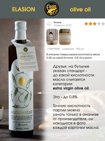 Эксклюзивное оливковое масло Агурелео Elasion Early Harvest Extra Virgin — это лимитированная серия для истинных ценителей, воплощение аутентичного вкуса Крита. Это масло, полученное из оливок раннего сбора щадящим холодным отжимом при температуре не выше 27°C, по сути является драгоценным соком свежей оливы. Именно такая технология, сохранившаяся спустя 4000 лет, наделяет натуральное оливковое масло, Греция насыщенным фруктовым вкусом с ярко выраженной горчинкой и пикантным перцовым послевкусием, а также сложным, глубоким ароматом. Низкая кислотность и высочайшее содержание полифенолов и антиоксидантов делают его не только кулинарным изыском, но и мощным источником пользы: нерафинированное масло способствует укреплению сердца и сосудов, снижению холестерина, борьбе с воспалениями и защите клеток от старения, что делает его идеальным выбором для диетического питания активных людей и детей.