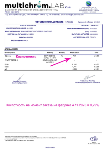 Отличительной чертой оливкового нерафинированного масла является исключительно низкая кислотность — менее 0,3%, что говорит о его премиальном качестве и пользе для здоровья. Оливковое масло, Греция богато природными антиоксидантами, полифенолами, витаминами и омега-кислотами, которые способствуют укреплению сердечно-сосудистой системы, снижению уровня холестерина и защите клеток от старения. Оливковое масло для салатов раскрывается фруктовыми нотами и ароматом свежих трав с легкой, благородной горчинкой, которая подтверждает натуральность и высочайшее качество.