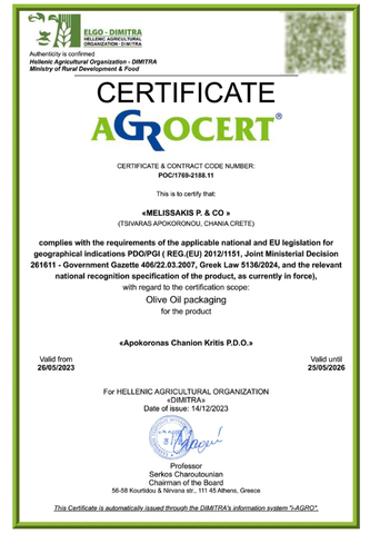 Масло оливковое Extra Virgin Apokoronas Chanion Kritis охраняемого обозначения происхождения PDO. PDO и PGI нельзя подделать, они защищены от мошенничества и являются единственным безопасным способом правильно понять, откуда взялось ваше масло. Каждое такое растительное масло имеет сертификат AgroCert, выданный министерством сельского хозяйства Греции. На банке должен быть желто-красный значок PDO - protected designation of origin, который означает, что продукт был целиком от начала и до конца изготовлен в одном регионе, в данном случае в регионе Apokoronas в провинции Ханья. Апокоронас простирается от предгорий Белых гор на север до побережья, на широкой равнине с пологими холмами. Местность очень зеленая и плодородная, что необычно для скалистого Крита.