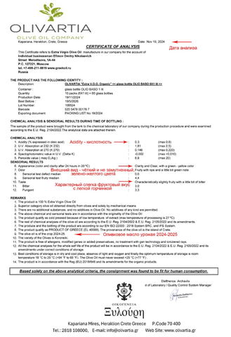 Одним из самых востребованных оливковых масел Olivartia из региона Мессара на Центральном Крите - это органическое оливковое масло Extra Virgin. Данное оливковое масло первого отжима обладает насыщенным фруктовым, свежим, травянистым, острым и сложным вкусом, но при этом гармоничным и хорошо структурированным. Сорт оливок Коронейки является наиболее распространенным сортом на острове. Греки называют Коронейки - "королевой оливок", она мелкая, но очень маслистая, - отдает до 25% масла из одного плода, поэтому масло получается концентрированным и насыщенным. Высокая польза этого оливкового масла Extra Virgin - благодаря тому, что оно производится при температуре не выше 27 градусов холодным прямым способом отжима без применения химических веществ и воды. Только сок свежей оливы. Традиционный способ холодной экстракции, которому 4000 лет. Критское оливковое масло славится по всему миру за исключительный вкус и непревзойденное качество в основном из-за микроклимата острова. Предпочтительнее использовать это масло для салатов, соусов, маринадов, а для любителей рыбы - можно запекать на этом масле рыбу, предварительно сбрызнув лимонным соком при температуре около 160 градусов. Нерафинированное оливковое масло полезно для здоровья: для сердца, для укрепления сосудов, снижет холестерин, уменьшает воспалительные процессы в организме. Растительное оливковое масло считается кладезем витаминов, обладает высоким содержанием мононенасыщенных жирных кислот, в первую очередь олеиновой кислоты Омега-9, содержит витамин Е, витамин А, полифенолы - природные антиоксиданты. Кислотность - 0,3%.